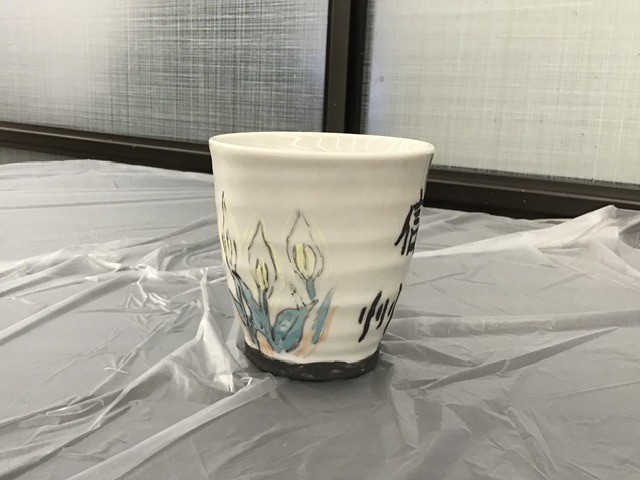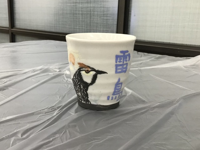 綺麗な花ととてもかっこいい雷鳥を絵付けした湯呑に仕上がりました〜